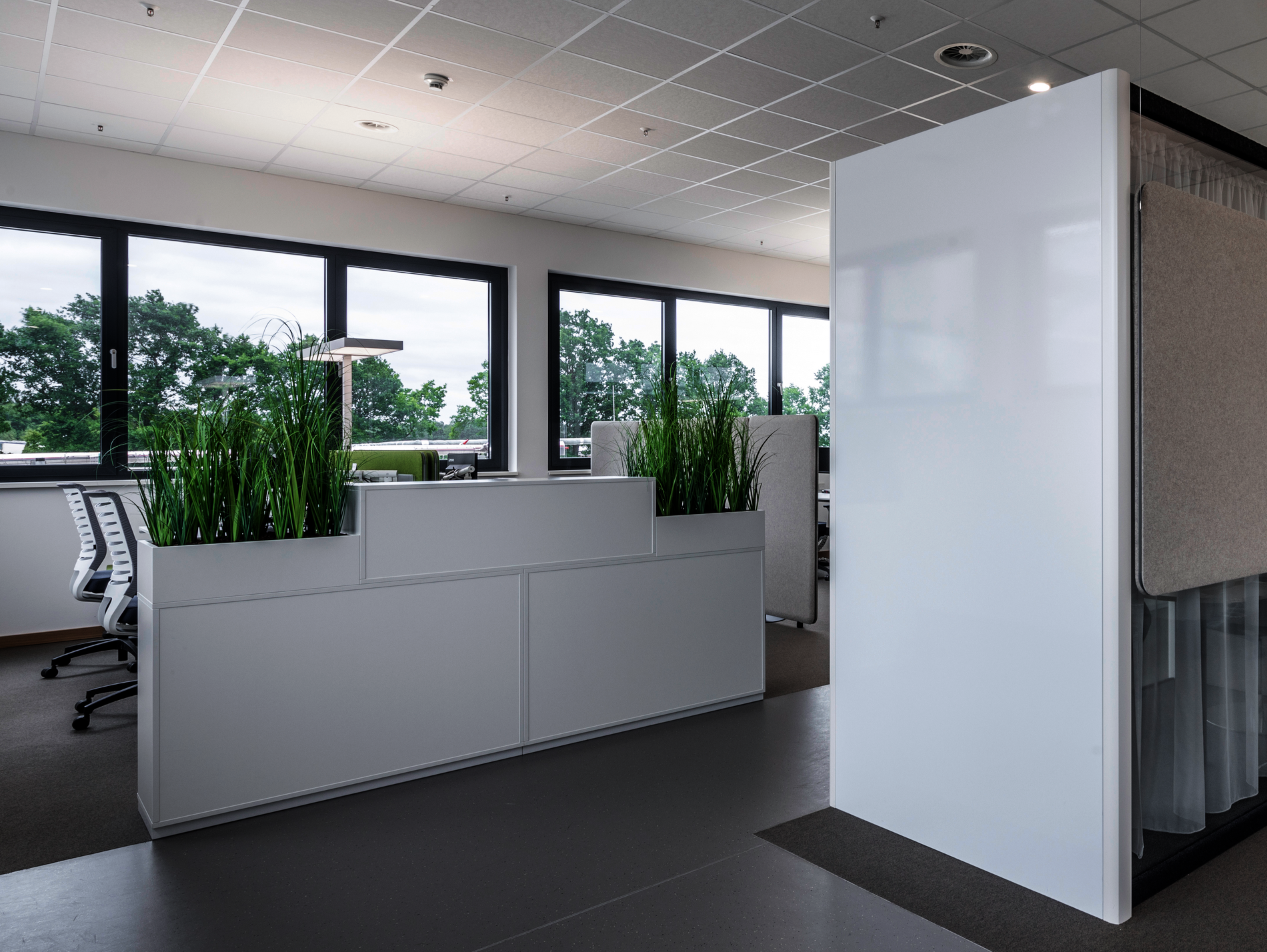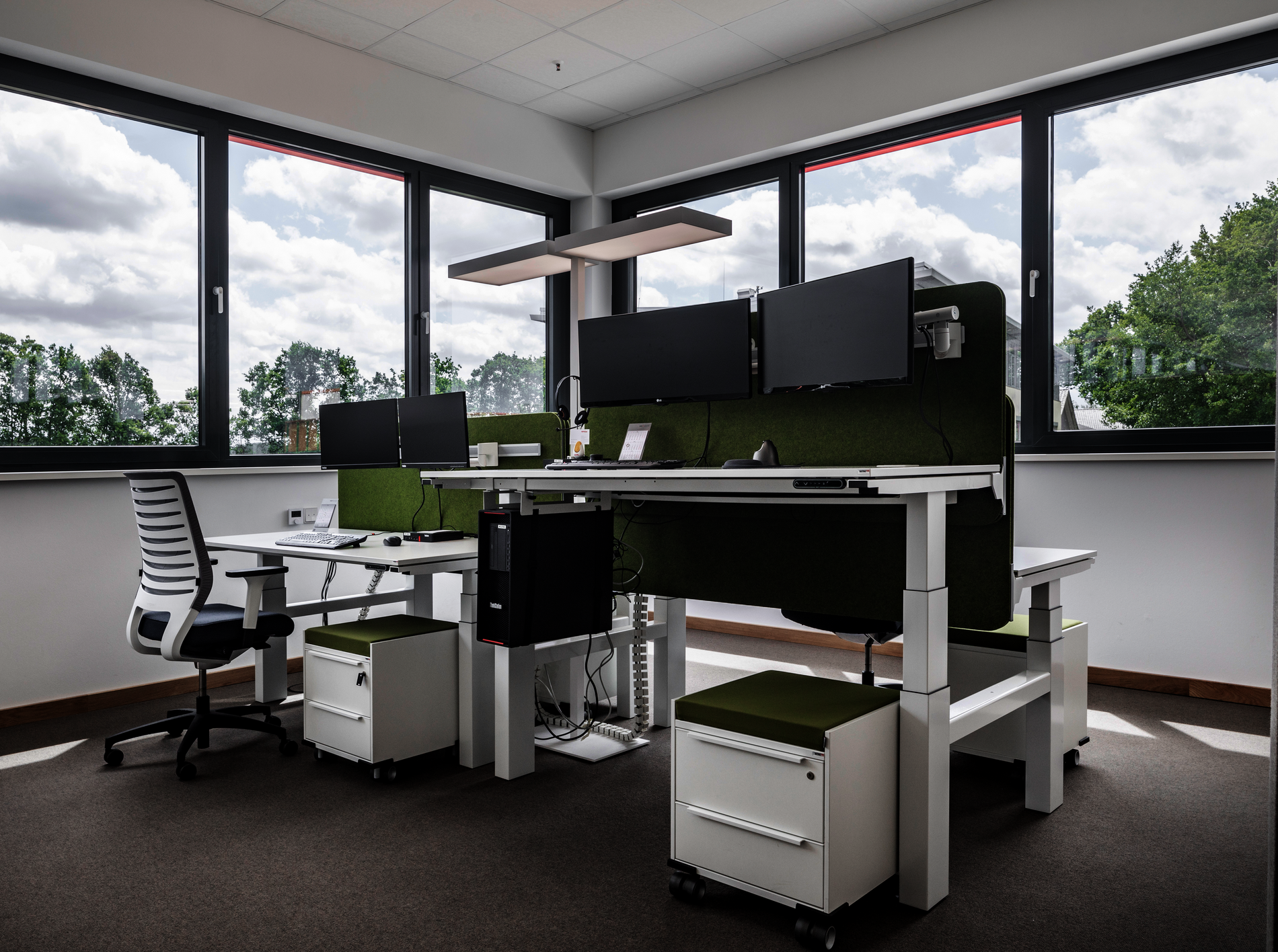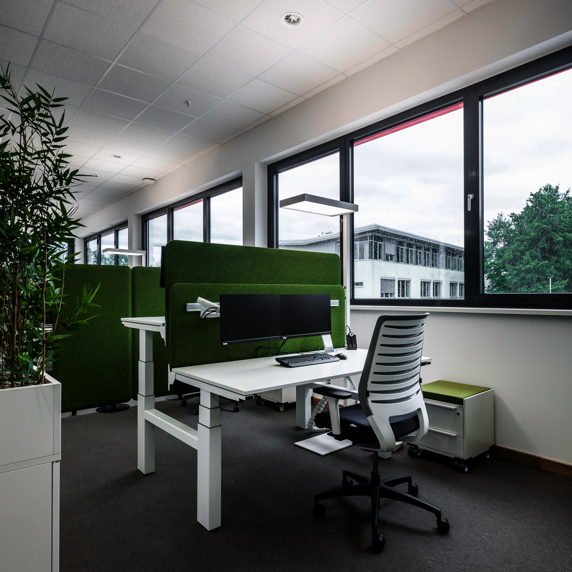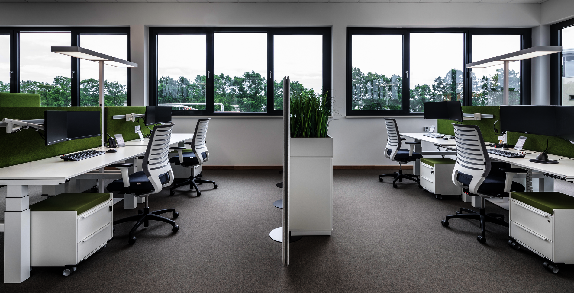Idee: Die Kombination aus freundlichen Farbakzenten, tageslichtdurchfluteten Räumen und ergonomischen Büromöbeln soll eine Wohlfühlatmosphäre erzeugen. Eingesetzte Möbelsysteme: WINEA ECO DUO, WINEA MAXX, WINEA SONIC