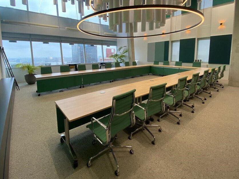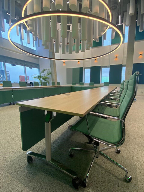 Die Vorteile liegen auf der Hand: Dank des Designs lassen sich die Tische schnell neu anordnen und flexibel an unterschiedliche Anforderungen anpassen. Ob große Runde oder kleine Gruppe – die Einrichtung bleibt jederzeit wandlungsfähig. Für technische Anschlussmöglichkeiten sorgt eine integrierte Netbox Point – dezent in der Tischmitte platziert, ermöglicht sie einen sauberen Zugang zu Strom und Daten. Ein weiteres Highlight: die grünen Filzfrontplatten, die farblich perfekt auf die vorhandenen Stühle abgestimmt wurden. Das Ergebnis ist ein einheitliches, professionelles Gesamtbild, das Funktionalität und Design gekonnt miteinander verbindet.