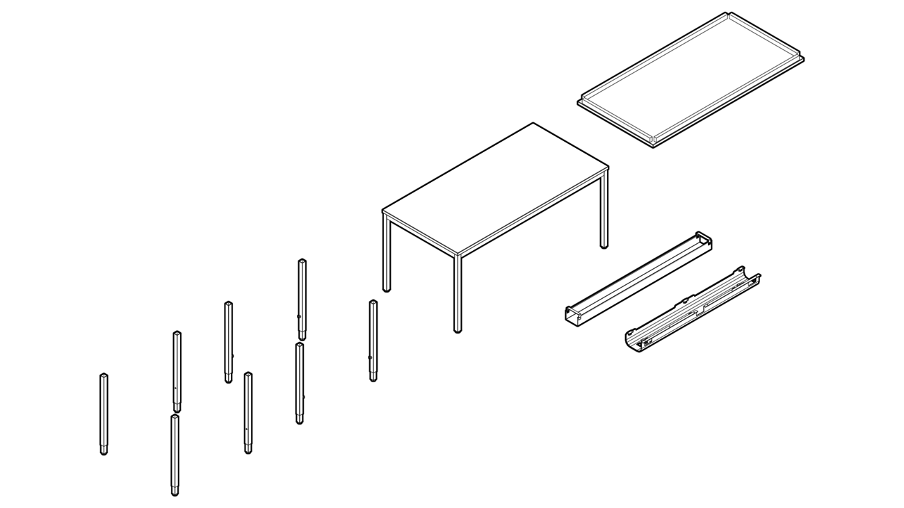 Die Kabelwanne aus Polyestervlies oder der Kabelkanal unter der Tischplatte können Netzteile und Leitungen aufnehmen. Für die vertikale Führung stehen eine Kabelgliederkette oder Kabelclips in schwarz oder weiß am Tischbein zur Verfügung.