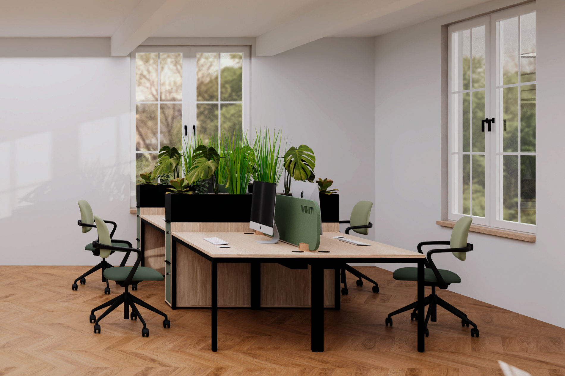 Ein wirtschaftlich eingerichtetes Büro muss nicht beliebig wirken. Durch die vielfältigen Dekore und Gestellfarben lässt sich WINEA FOUR individuell harmonisch in unterschiedliche Raumkonzepte integrieren. In Kombination mit anderen WINI Produkten entstehen funktionale und zugleich gestalterisch überzeugende Arbeitsumgebungen.