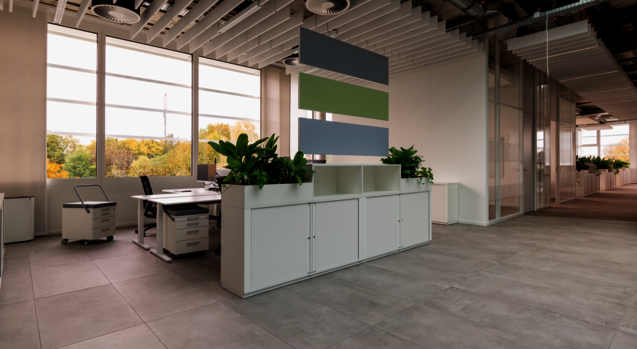 Cross-roller cabinets near the workstation provide additional storage space. The Cabinets are both a privacy screen and a meeting point for colleagues to have a Short exchange. Various panels at the Desk and in the room optimize the acoustics and provide visual screening in the open space.