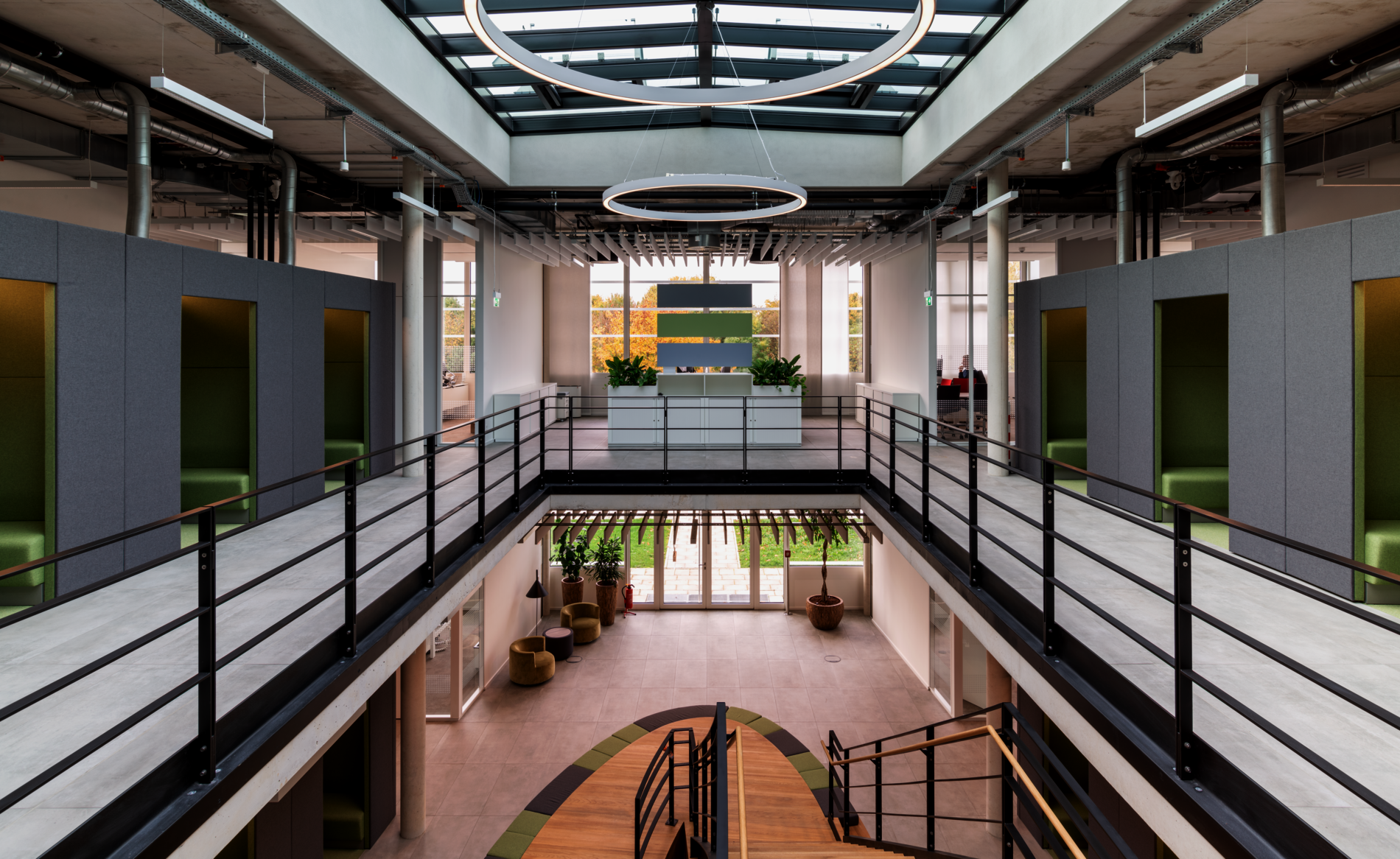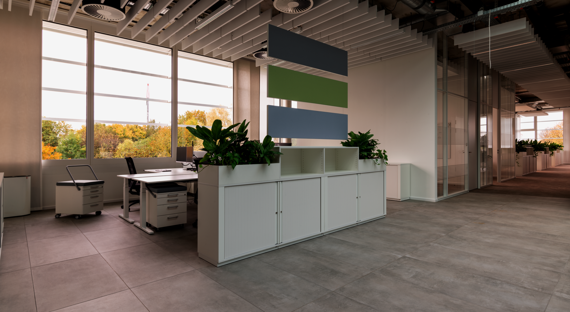 Cross-roller cabinets near the workstation provide additional storage space. The Cabinets are both a privacy screen and a meeting point for colleagues to have a Short exchange. Various panels at the Desk and in the room optimize the acoustics and provide visual screening in the open space.