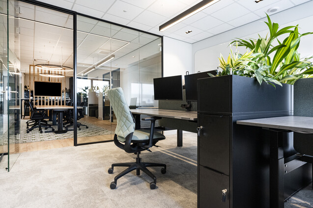 The focus is on elegant conference tables with integrated power supply - ideal for concentrated meetings and efficient working. In the team offices, our duo workstations with plants create a calm, natural atmosphere. The concept is complemented by storage space close to workstations, which creates a pleasant zoning and keeps the overall picture clear and tidy.