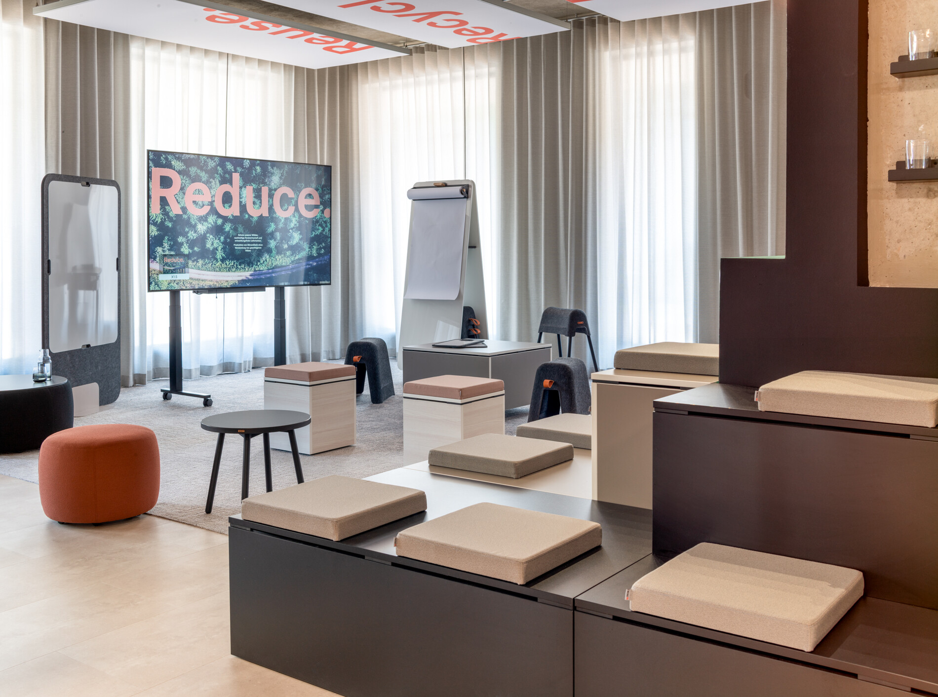 Modulare Möbel, mobile Elemente, individuell konfigurierbare Systeme: Der Showroom zeigt, dass Flexibilität kein Marketing-Versprechen sein muss, sondern handfest und konkret sein kann. Dass Räume sich verändern dürfen und sollten. Und dass Nachhaltigkeit manchmal schlicht bedeutet, vorhandene Dinge weiterzudenken, statt immer neu anzufangen.