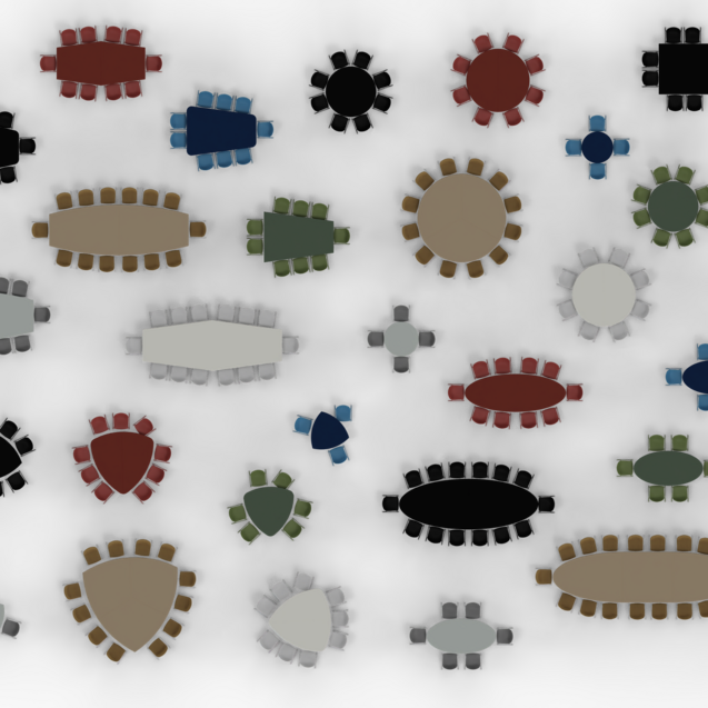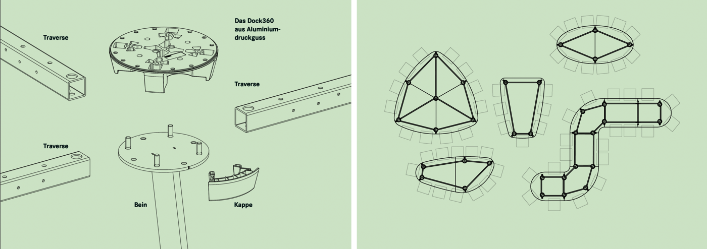 Jede der vier Kammern des Dock360 kann jeweils eine Traverse aufnehmen. Die Traversen werden mit dem Dock und den Tischbeinen, wodurch eine feste Verbindung entsteht, die die Stabilität der gesamten Tischkonfiguration gewährleistet. Durch die Möglichkeit, jede Traverse um 90° zu schwenken, lassen sich sowohl klassische lineare Verkettungen als auch organische Freiformlayouts realisieren.